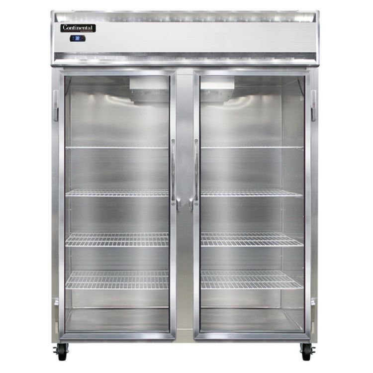 The Continental Refrigerator 2RESNSAGD Extra-Wide Refrigerator Reach-in 57"W is a premium cooling solution featuring a two-section design tailored to meet high-capacity commercial refrigeration needs. Its stainless steel exterior delivers durability, while the aluminum interior ensures efficient thermal management. This refrigerator's shallow depth design optimizes space in busy kitchens, making it suitable for environments where space conservation is crucial. The inclusion of full-height glass doors allows for easy visibility of stored items, locked securely with cylinder locks to maintain safety. Technologically advanced, it features an electronic control system with a digital display for precise temperature management, along with a hi-low alarm to ensure contents remain at optimal conditions. Utilizing R290 hydrocarbon refrigerant, this unit is both environmentally friendly and efficient, powered by a 1/3 HP compressor. Its design is cETLus and NSF certified, asserting its compliance with stringent safety and sanitation standards. Measuring 57 inches in width, this refrigerator is ideal for various segment markets within the food service industry, from bustling restaurants to large catering operations, providing a dependable and energy-efficient refrigeration solution that accommodates a broad range of storage requirements.