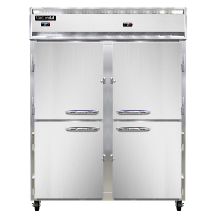 The Continental Refrigerator 2RFENSAHD Extra-Wide Refrigerator/Freezer Reach-in 57"W is a versatile two-section unit designed for commercial kitchen applications, offering a blend of durability, efficiency, and advanced technological features. Measuring 57 inches wide, this extra-wide model provides ample storage with four half-height solid self-closing doors, equipped with cylinder locks for security. The stainless steel exterior and aluminum interior ensure longevity and easy maintenance. This unit integrates a self-contained refrigeration system with electronic control and a digital display for precise temperature management. The freezer compartment is adjustable to operate as low as -10°F, catering to a wide range of storage requirements. Enhanced with a high-low alarm and LED interior lighting, it ensures optimal visibility and monitoring of stored contents. Six epoxy-coated steel shelves provide flexible storage solutions, while the electric condensate evaporator maintains an efficient operation. Utilizing R290 Hydrocarbon refrigerant and powered by dual 1/4 & 1/2 HP, the unit is environmentally conscious and energy-efficient. Certified by cETLus and NSF, the Continental Refrigerator 2RFENSAHD is suitable for diverse markets, from food service industries to institutional kitchens, highlighting its compliance with safety standards and its commitment to sustainability and performance.