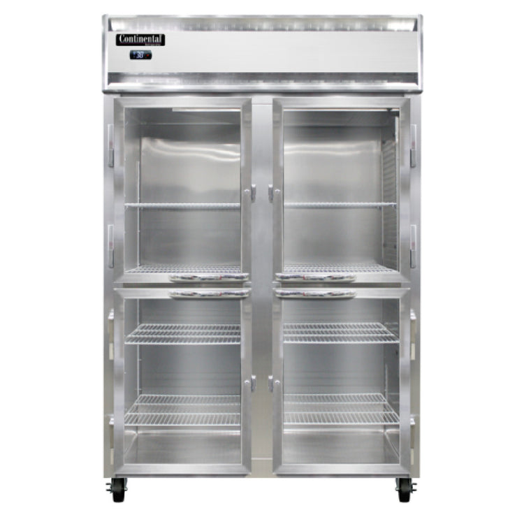 Continental Refrigerator, 2RNSAPTHD-GD-SD, Refrigerator, 50 cu. ft. capacity, pass-thru, two-section, self-contained refrigeration, standard depth, half-height glass doors on front, half height solid doors on rear, electronic controller with digital display, electric condensate evaporator, stainless steel exterior, aluminum interior, 5" casters, NEMA-5-15P, 1/2 HP, cETLus, NSF, Made in the USA