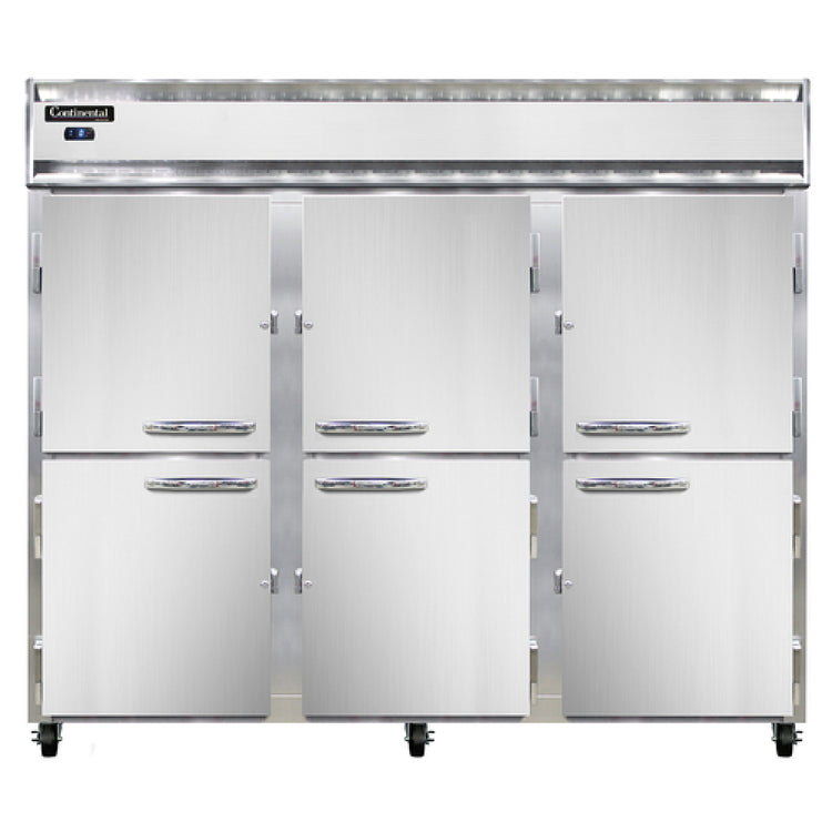 The Continental Refrigerator 3FESNSSHD Extra-Wide Freezer Reach-in 85-1/2"W is a versatile choice for various commercial environments, particularly in food service industries requiring ample storage space. This extra-wide, three-section freezer features self-contained refrigeration, ensuring efficient cooling and convenience in a singular unit. The stainless steel exterior and interior enhance durability and cleanliness, while the shallow depth design facilitates integration into diverse kitchen layouts. Equipped with half-height solid doors and cylinder locks, it offers security and ease of access. Its advanced electronic control system, complete with a digital display and hi-low alarm, provides precise temperature monitoring, safeguarding stored goods. The electric condensate evaporator and R290 Hydrocarbon refrigerant emphasize energy efficiency and environmental responsibility. With a robust 1-1/4 HP motor, this freezer is engineered for reliable performance, marked by its cETLus and NSF certifications, ensuring adherence to safety and sanitation standards. Measuring 85-1/2 inches in width, it is an ideal solution for businesses that require extensive freezer space within a confined footprint, making it a strategic investment for restaurants, catering services, and other food-related enterprises seeking to optimize their cold storage capabilities with a focus on sustainability and operational efficiency.