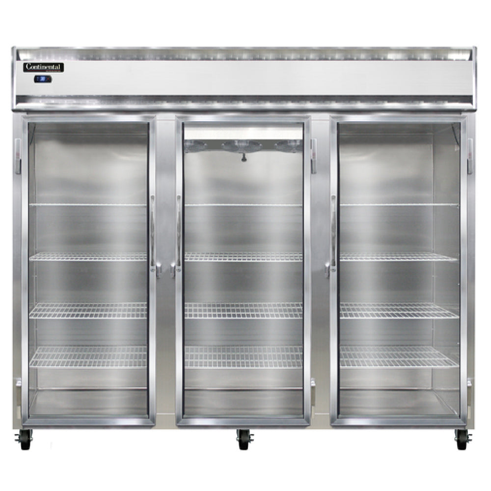 The Continental Refrigerator 3RENSAGD Extra-Wide Refrigerator Reach-in 85-1/2"W is a high-performance refrigeration unit designed for various commercial applications. With its expansive width of 85-1/2 inches, this three-section refrigerator provides ample storage space, making it an ideal choice for catering to large-scale food service needs. Its self-contained refrigeration system ensures efficient cooling, facilitated by the R290 Hydrocarbon refrigerant and a robust 1/2 HP compressor. Constructed with a stainless steel exterior and an aluminum interior, the refrigerator promises durability and longevity. The full-height glass doors are equipped with cylinder locks, offering both visibility and security. For user-friendly operation, the refrigerator incorporates an electronic control system with a digital display, as well as a hi-low alarm to alert users of temperature fluctuations. An electric condensate evaporator further enhances its efficiency by managing moisture effectively. Certified by cETLus and NSF, the refrigerator meets stringent safety and sanitation standards, underscoring its reliability in professional settings. This product is tailored for diverse markets, including restaurants, hotels, and institutional kitchens, where both capacity and performance are crucial. Its standard depth design integrates seamlessly into various workspace layouts, providing a versatile refrigeration solution.