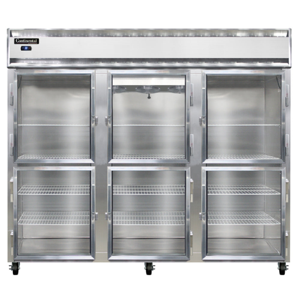 The Continental Refrigerator 3RENSAGDHD Extra-Wide Refrigerator Reach-in 85-1/2"W is a robust, versatile refrigeration solution designed to meet the diverse needs of commercial kitchens and foodservice establishments. This three-section refrigerator boasts a spacious 85-1/2-inch width, making it ideal for operations requiring generous storage capacity. The unit features a durable stainless steel exterior and a practical aluminum interior, ensuring long-lasting performance and easy maintenance. Its standard depth design is complemented by wide half-height glass doors, which not only provide easy access to stored items but also enhance visibility and display capabilities. Security is ensured with cylinder locks, while the electronic control with digital display allows for precise temperature management. The hi-low alarm and electric condensate evaporator further enhance its functionality, ensuring reliable operation. Utilizing environmentally-friendly R290 Hydrocarbon refrigerant and powered by a 1/2 HP compressor, this refrigerator is both efficient and sustainable. Certified with cETLus and NSF, it meets stringent safety and sanitation standards, making it a dependable choice for various market segments within the foodservice industry, from bustling restaurants to institutional kitchens, seeking a blend of performance, durability, and eco-conscious refrigeration solutions.