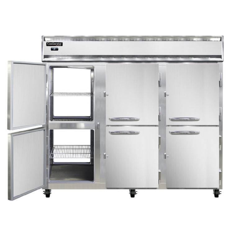The Continental Refrigerator 3RENSAPTHD Extra-Wide Refrigerator is a versatile and robust solution tailored for commercial kitchens and food service establishments requiring efficient and expansive refrigeration. With an extra-wide 85-1/2"W three-section design, this pass-thru refrigerator is meticulously constructed with a stainless steel exterior and aluminum interior, ensuring durability and ease of maintenance in demanding environments. It features standard depth and half-height solid doors equipped with cylinder locks, providing secure storage while offering convenient access from both sides. The inclusion of electronic control with a digital display and a hi-low alarm system enhances operational efficiency and ensures precise temperature management. Operating with a self-contained refrigeration unit powered by a 1/2 HP compressor, the refrigerator utilizes R290 Hydrocarbon refrigerant, reflecting a commitment to eco-friendly cooling solutions. Furthermore, the electric condensate evaporator demonstrates advanced moisture management, reducing maintenance requirements. Certified by cETLus and NSF, this refrigerator meets stringent safety and sanitation standards, making it an ideal choice for markets such as hospitality, catering, and institutional food service, where reliability and performance are paramount. The thoughtful integration of cutting-edge technology and user-focused features positions the Continental Refrigerator 3RENSAPTHD as a valuable asset in any professional culinary environment.