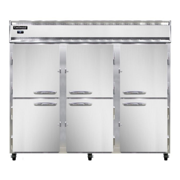Continental Refrigerator, 3RENSSPTHD-SD-GD, Extra-Wide Refrigerator, 75 cu. ft. capacity, pass-thru, 85-1/2" wide three-section, self-contained refrigeration, standard depth, half-height solid doors on front, half-height glass doors on rear, electronic controller with digital display, electric condensate evaporator, stainless steel exterior & interior, 5" casters, NEMA-5-15P, 1/2 HP, cETLus, NSF, Made in the USA