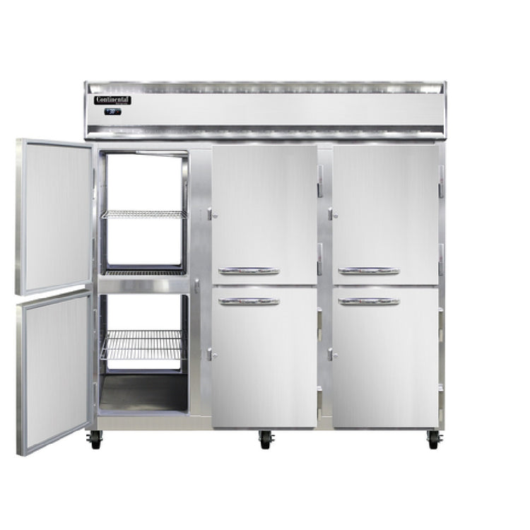 The Continental Refrigerator 3RNSAPTHD Refrigerator Pass-thru Three-section is a sophisticated refrigeration solution designed for versatile applications in commercial kitchens and food service operations. This unit features a self-contained refrigeration system, ensuring efficient and consistent cooling performance. The exterior is constructed from durable stainless steel, while the interior is crafted from aluminum, providing a balance of robustness and lightweight functionality. With a standard depth design, this refrigerator is equipped with half-height solid doors that include cylinder locks for enhanced security. The electronic control with digital display allows for precise temperature adjustments and monitoring, while the hi-low alarm system ensures optimal performance and alerts users to any deviations. Employing the environmentally friendly R290 Hydrocarbon refrigerant, this refrigerator supports sustainability initiatives. Powered by a 1/2 HP compressor, the unit is certified by cETLus and NSF, confirming its adherence to high safety and sanitation standards. Its pass-thru configuration and three-section design make it suitable for high-traffic environments, allowing for seamless access from both sides and facilitating efficient workflow in busy kitchens. The Continental Refrigerator 3RNSAPTHD is an exemplary choice for businesses seeking reliable, secure, and environmentally conscious refrigeration solutions.