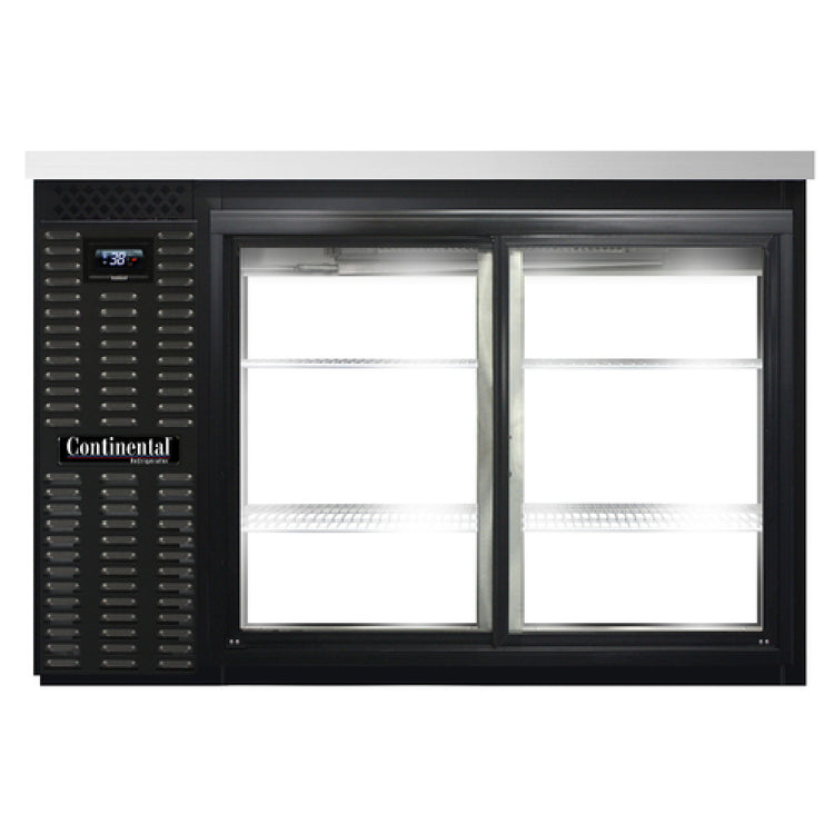 The Continental Refrigerator BB50NSGDPT Refrigerated Back Bar Cooler Pass-thru 50"W is engineered with precision to meet the diverse needs of the food service industry. This compact yet spacious cooler, measuring 50 inches in width and 34-3/4 inches in height, provides a generous 16.0 cubic feet of storage capacity. It features a front-breathing design, making it suitable for tight spaces. The stainless steel top, coupled with a black enamel finish exterior, offers durability and a sleek appearance. Inside, the reinforced stainless steel back and side panels, along with an epoxy-coated steel shelf system, ensure robust support for stored items. The sliding glass doors provide easy access, while the electronic controller with a digital display and hi-low alarm ensure precise temperature control. Utilizing R290 hydrocarbon refrigerant and powered by a 1/4 HP self-contained refrigeration system, this unit balances efficiency and environmental responsibility. Certified by cETLus and NSF, it meets rigorous safety and sanitation standards, making it a reliable choice for bars, restaurants, and other commercial settings where preserving beverage quality is paramount.