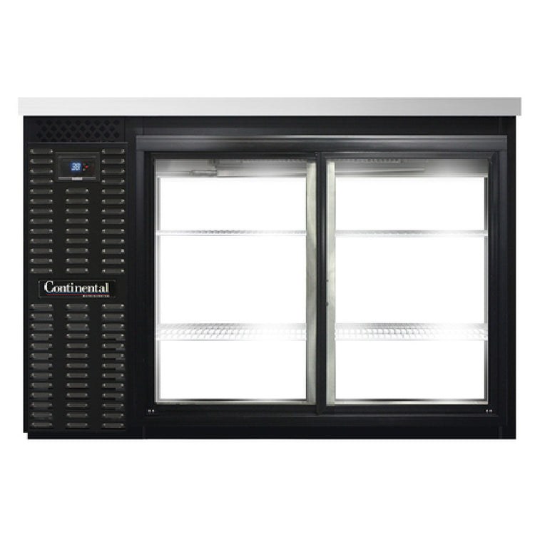 The Continental Refrigerator BB50SNSGDPT Refrigerated Back Bar Cooler - Shallow Depth is a meticulously engineered unit designed for seamless integration into compact spaces, making it an exceptional choice for bars and restaurants with limited room. With dimensions of 50"W and 34-3/4"H, this cooler offers a generous 13.0 cubic feet of storage capacity. Its front-breathing design ensures efficient air circulation, while the pass-thru feature enhances accessibility from both sides. The cooler is equipped with sliding glass doors for easy product visibility and access, and an electronic controller with a digital display and hi-low alarm for precise temperature management. The exterior boasts a sleek black enamel finish, complemented by stainless steel interior back and side panels, and a reinforced stainless steel floor, promising durability and ease of maintenance. epoxy coated steel shelves provide robust support for varied inventory needs. The unit employs a self-contained refrigeration system using R290 hydrocarbon refrigerant, powered by a 1/4 HP compressor, ensuring energy efficiency and eco-friendliness. Certified by cETLus and NSF, this back bar cooler meets stringent safety and sanitation standards, representing a reliable and high-performance refrigeration solution for settings demanding both functionality and style.