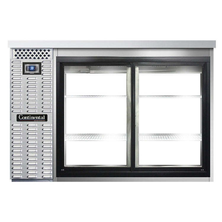 The Continental Refrigerator BB50SNSSSGDPT Refrigerated Back Bar Cooler - Shallow Depth is a precision-engineered solution tailored for the hospitality industry with spatial constraints. With a pass-thru configuration, this cooler measures 50 inches in width and 34-3/4 inches in height, offering a storage capacity of 13.0 cubic feet. Notably, it features a front-breathing design and is equipped with a high-grade stainless steel top, ensuring durability and longevity. The sliding glass doors provide easy access, while the electronic controller with digital display and hi-low alarm ensures precise temperature monitoring. The stainless steel exterior and interior back and side panels are complemented by a reinforced stainless steel floor, enhancing the unit's structural integrity. Inside, epoxy-coated steel shelves offer reliable support for diverse storage needs. The cooler features self-contained refrigeration using R290 hydrocarbon refrigerant and is powered by a 1/4 HP compressor. Adhering to stringent safety and sanitation standards, it holds cETLus and NSF certifications, underscoring its reliability in demanding environments. The BB50SNSSSGDPT is an optimal choice for bars and restaurants seeking efficient, high-performance refrigeration in a compact form factor.