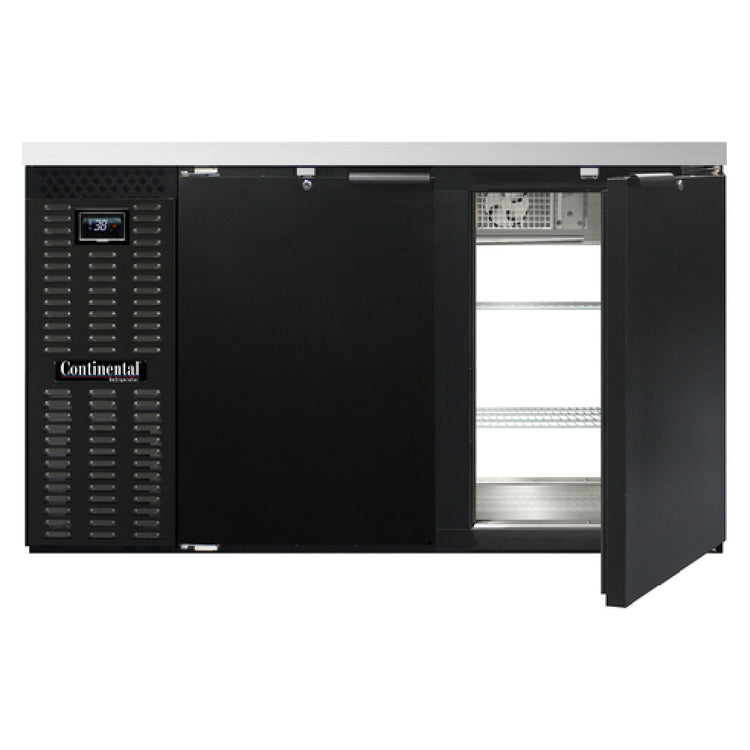 The Continental Refrigerator BB59NPT Refrigerated Back Bar Cooler Pass-thru 59"W is an advanced cooling solution designed for various industry segments requiring efficient beverage storage. With dimensions of 59 inches in width and 34-3/4 inches in height, this cooler offers a substantial storage capacity of 22.0 cubic feet. Its front breathing design and self-contained refrigeration system, utilizing R290 hydrocarbon refrigerant, ensure optimal cooling performance and environmental friendliness. The cooler is equipped with a stainless steel top, black enamel finish exterior, and stainless steel interior back and side panels, complete with a reinforced stainless steel floor for enhanced durability. Featuring four doors with locks, it provides secure access for pass-thru convenience. The epoxy-coated steel shelves are designed for lasting support and flexibility. The electronic controller, with a digital display and hi-low alarm, allows for precise temperature monitoring and control. Powered by a 1/4 HP motor, this unit is both cETLus and NSF certified, highlighting its compliance with safety and sanitation standards. The Continental Refrigerator BB59NPT is ideally suited for bars, restaurants, and catering services that demand high-quality, reliable refrigeration equipment to meet their diverse operational needs.
