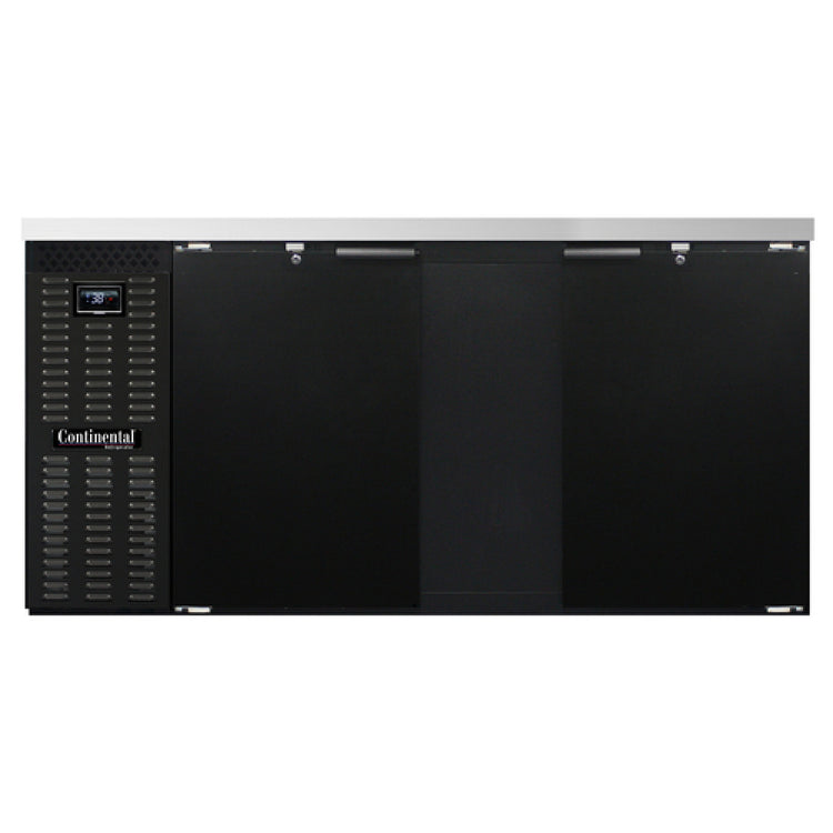 The Continental Refrigerator BB69N Refrigerated Back Bar Cooler is a top-tier refrigeration solution designed for commercial environments requiring efficient storage and cooling. Measuring 69 inches in width and 34-3/4 inches in height, this unit offers a substantial 26.0 cubic feet of storage capacity, ideal for bars, restaurants, and catering services. Its front-breathing design is complemented by a durable stainless steel top, ensuring long-lasting performance and ease of maintenance. The cooler is equipped with two doors featuring locks, providing secure access to its contents. An electronic controller with a digital display and hi-low alarm enhances the unit's functionality, offering precise temperature management. The exterior is finished with black enamel, while the interior boasts stainless steel back and side panels with a reinforced stainless steel floor, ensuring robust construction and easy cleaning. Epoxy-coated steel shelves provide versatile storage options. The self-contained refrigeration system utilizes R290 hydrocarbon refrigerant, meeting modern environmental standards. Powered by a 1/4 HP compressor, the BB69N is certified by cETLus and NSF, underscoring its compliance with safety and sanitation standards. This back bar cooler seamlessly combines functionality and reliability, making it a valuable addition to any professional food and beverage service operation.
