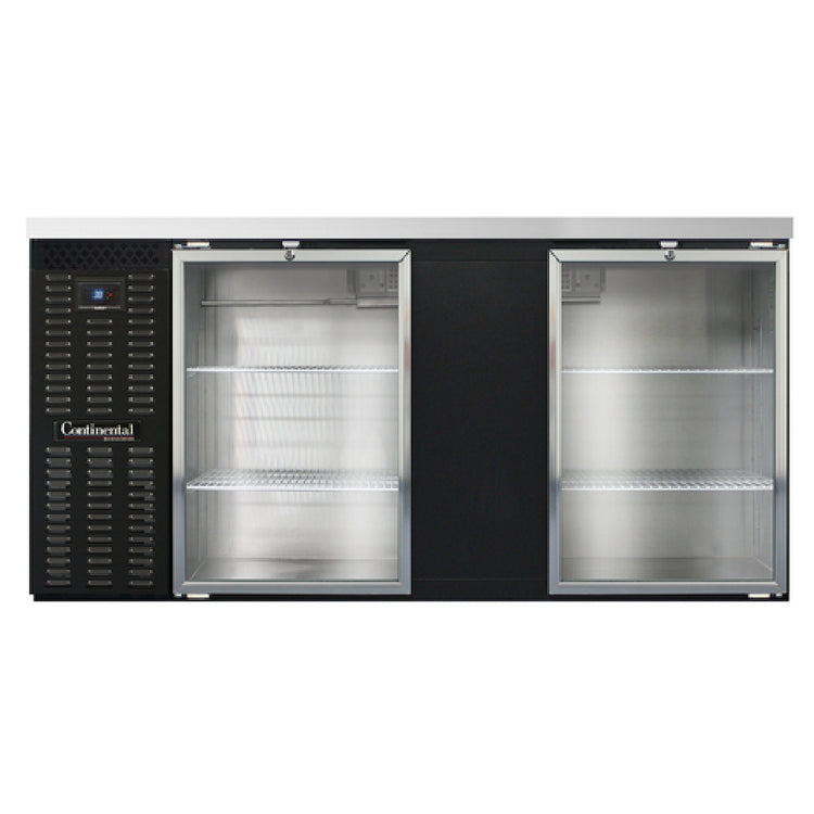 The Continental Refrigerator BB69SNGD Refrigerated Back Bar Cooler - Shallow Depth 69"W is a versatile refrigeration unit designed for efficient use in various commercial settings, including bars and restaurants with limited space. Its shallow depth design maximizes space utilization without compromising on capacity, offering 18.0 cubic feet of storage. The cooler features a durable stainless steel top, complemented by a black enamel finish exterior, providing both aesthetic appeal and durability. With two glass doors equipped with locks, it ensures secure storage and easy visibility of contents. An electronic controller with a digital display and hi-low alarm enhances operational efficiency and temperature management. Inside, the stainless steel back and side panels, along with a reinforced stainless steel floor, provide a robust and hygienic storage environment, while epoxy coated steel shelves offer flexibility in organizing products. The self-contained refrigeration system utilizes R290 hydrocarbon refrigerant, known for its eco-friendly properties, powered by a 1/4 HP compressor. The front-breathing design allows for placement flexibility in tight spaces. The unit is cETLus and NSF certified, ensuring compliance with safety and sanitation standards. This cooler is an ideal choice for businesses seeking a reliable, space-efficient refrigeration solution.