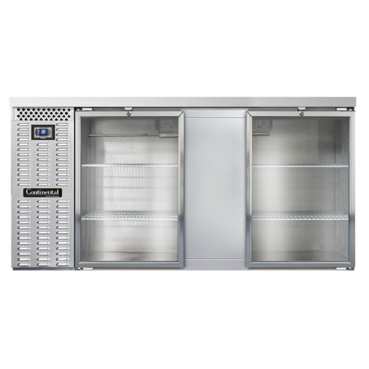 The Continental Refrigerator BB69SNSSGD Refrigerated Back Bar Cooler Shallow Depth is a versatile and efficient cooling solution tailored for hospitality environments that demand reliability and style. With dimensions of 69 inches in width and 34-3/4 inches in height, this cooler features a stainless steel top that complements its robust construction, making it both a practical and aesthetically pleasing addition to any bar setup. It offers a substantial 18.0 cubic feet of storage space, ideal for maintaining a variety of beverages at optimal temperatures. The unit's front-breathing design and self-contained refrigeration system utilize R290 hydrocarbon refrigerant, ensuring energy efficiency and environmental responsibility. Equipped with two glass doors secured with locks, the cooler allows for secure and visible storage. An electronic controller with a digital display and hi-low alarm offers precise temperature management. The stainless steel exterior and interior, including reinforced back, side panels, and floor, ensure durability and ease of cleaning. Additionally, the epoxy-coated steel shelves provide sturdy support for various products. Powered by a 1/4 HP compressor, this back bar cooler is cETLus and NSF certified, ensuring compliance with safety and sanitation standards. Its shallow depth design is particularly suited for venues with space constraints, maximizing utility without compromising performance.