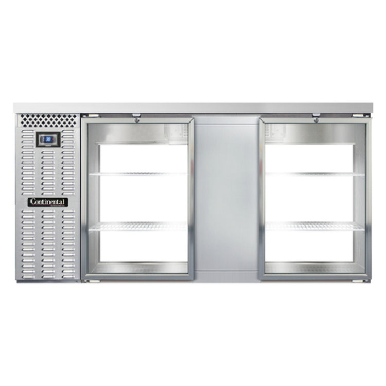 The Continental Refrigerator BB69SNSSGDPT Refrigerated Back Bar Cooler - Shallow Depth is a state-of-the-art cooling solution designed for professional bar settings and commercial establishments requiring efficient and compact refrigeration. Featuring a pass-thru design, this unit measures 69 inches in width and 34-3/4 inches in height, optimizing space with a shallow depth that suits narrow spaces. Its stainless steel top, exterior, and interior back and side panels ensure durability and a sleek aesthetic, while the reinforced stainless steel floor enhances structural integrity under heavy use. With a capacity of 18.0 cubic feet, this cooler offers ample storage space, distributed across epoxy-coated steel shelves to maintain a hygienic environment. The unit incorporates front breathing technology for seamless installation in tight spots, and its self-contained refrigeration system uses environmentally friendly R290 hydrocarbon refrigerant. Equipped with a 1/4 HP motor, it delivers reliable cooling performance. The cooler features four glass doors with locks for secure access and easy visibility of contents. An electronic controller with a digital display and hi-low alarm system ensures precise temperature management, safeguarding perishable items. Certified by cETLus and NSF, this back bar cooler meets stringent safety and sanitation standards, making it a dependable choice for diverse market segments in the food and beverage industry.