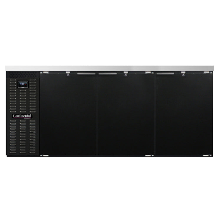 The Continental Refrigerator BB79N Refrigerated Back Bar Cooler is a premium cooling solution for commercial establishments, measuring 79 inches in width and 34-3/4 inches in height, with a substantial 28.0 cubic feet capacity. Its front-breathing design enhances placement versatility in confined spaces, while the robust stainless steel top ensures durability. This cooler is equipped with three lockable doors, providing secure storage for beverages. The electronic controller with a digital display and hi-low alarm offers precise temperature management, vital for maintaining product quality. Its exterior features a sleek black enamel finish that complements various decor styles, while the stainless steel interior back and side panels, along with a reinforced stainless steel floor, guarantee a hygienic and resilient storage environment. The inclusion of epoxy-coated steel shelves ensures long-lasting use. This unit employs self-contained refrigeration with R290 Hydrocarbon refrigerant, making it an environmentally friendly choice. Powered by a 1/4 HP compressor, it meets cETLus and NSF standards, confirming its reliability and compliance with industry safety regulations. The Continental Refrigerator BB79N is an exceptional choice for bars, restaurants, and hospitality venues seeking efficient and stylish refrigeration solutions.