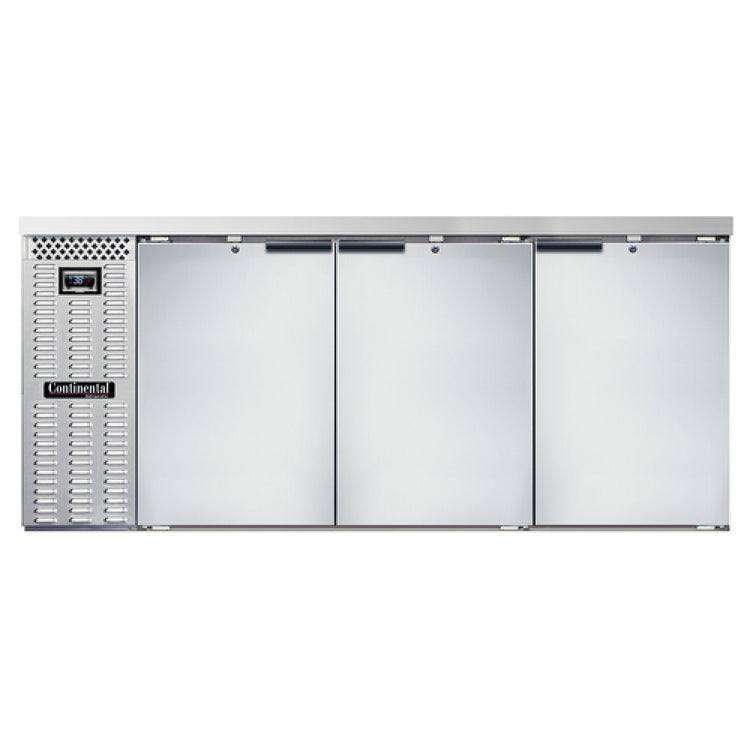 The Continental Refrigerator BB79NSS Refrigerated Back Bar Cooler is a versatile refrigeration unit designed to meet the demands of various market segments, such as bars and restaurants. Measuring 79 inches wide and 34-3/4 inches high, it offers a substantial 28.0 cubic feet of storage space, making it suitable for high-volume operations. This cooler is equipped with a front-breathing stainless steel top, which enhances its durability and ease of cleaning. The unit features three doors with locks, ensuring the security of stored items. An electronic controller with a digital display and hi-low alarm enhances temperature monitoring precision. Its exterior, interior back, and side panels are constructed from stainless steel, and the floor is reinforced for added strength. The cooler includes epoxy-coated steel shelves that provide robust support for various beverage containers. Utilizing R290 Hydrocarbon refrigerant and a 1/4 HP compressor, it delivers efficient cooling while adhering to environmental standards. The self-contained refrigeration system simplifies installation and maintenance. Certified by cETLus and NSF, this back bar cooler meets stringent safety and sanitation standards, making it a reliable choice for professional environments looking for efficient and secure cooling solutions.