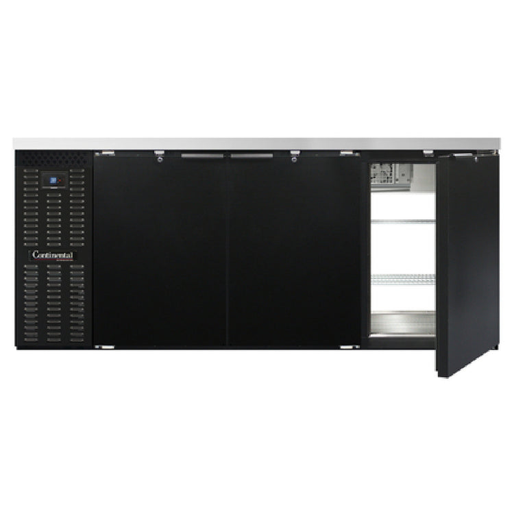 The Continental Refrigerator BB79SNPT Refrigerated Back Bar Cooler - Shallow Depth Pass-thru is a highly efficient solution for businesses requiring compact yet versatile refrigeration. With a width of 79 inches and a height of 34-3/4 inches, this unit offers a storage volume of 22.0 cubic feet, making it suitable for settings with limited space. Its front-breathing design, coupled with a shallow depth of 25 inches, allows for seamless integration into various layouts. The cooler boasts a stainless steel top and a robust black enamel finish exterior, ensuring durability and a sleek appearance. Featuring stainless steel interior back and side panels, along with a reinforced stainless steel floor and epoxy-coated steel shelves, it promises exceptional longevity and hygienic storage conditions. Equipped with six lockable doors, it guarantees secure access. The electronic controller with a digital display and hi-low alarm facilitates precise temperature management. Utilizing R290 Hydrocarbon refrigerant and powered by a 1/4 HP compressor, this self-contained refrigeration system is both environmentally friendly and efficient. Certified by cETLus and NSF, the Continental Refrigerator BB79SNPT is an ideal choice for bars and restaurants seeking reliability, quality, and space optimization in refrigeration.