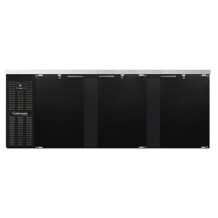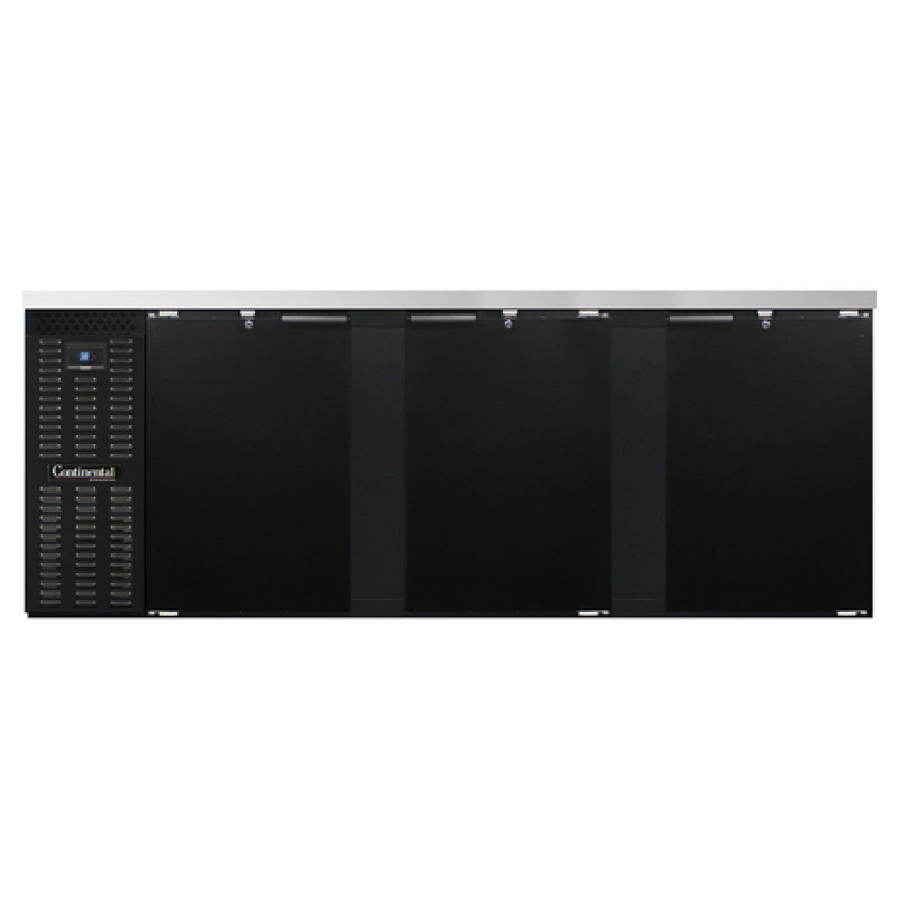 The Continental Refrigerator BB90SN Refrigerated Back Bar Cooler Shallow Depth 90"W is a high-performance solution for businesses seeking efficient refrigeration with a compact footprint. With dimensions of 90 inches in width and 34-3/4 inches in height, this cooler offers a substantial storage capacity of 25.0 cubic feet, making it suitable for various commercial settings. Its front breathing design and 23-inch shallow depth enable flexible installation in tight spaces, optimizing the use of available room. The unit is equipped with a robust stainless steel top, ensuring durability and easy maintenance. It features three doors with locks, enhancing security and accessibility. The electronic controller with a digital display and hi-low alarm provides precise temperature management and monitoring, safeguarding stored contents. The cooler's black enamel finish exterior combined with the stainless steel interior back and side panels, as well as a reinforced stainless steel floor, delivers both aesthetic appeal and robust functionality. Additionally, epoxy coated steel shelves support versatility in storage configurations. Utilizing R290 Hydrocarbon refrigerant and powered by a 1/4 HP motor, this self-contained refrigeration system ensures energy efficiency and environmental responsibility. The Continental Refrigerator BB90SN is certified by cETLus and NSF, affirming its compliance with safety and sanitation standards. This product represents a versatile and reliable choice for diverse industry needs.