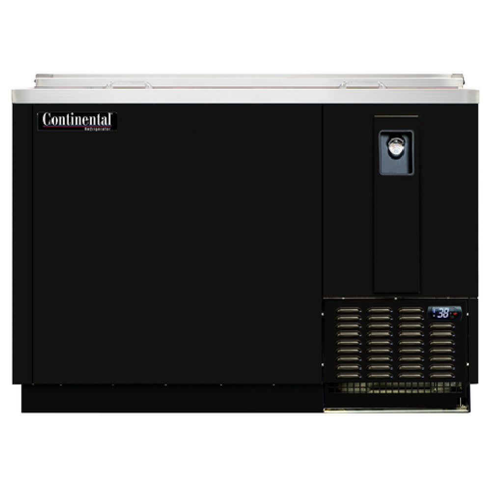 The Continental Refrigerator CBC50 Flat Top Bottle Cooler 50"W is a highly efficient cooling solution tailored for commercial settings, exemplifying its robust capacity and design. With a sleek stainless steel top and (2) slide back lids, this cooler efficiently supports high-volume environments. It boasts a remarkable capacity of accommodating up to (18) cases of 12 oz bottles or (27) cases of 12 oz cans, ensuring ample storage for various beverage needs. The cooler's exterior is crafted from textured baked black enamel, providing both durability and an appealing aesthetic. Inside, the galvanized interior ensures longevity and ease of maintenance. The CBC50 features an electronic controller with a digital display and a hi-low alarm, offering precise temperature management for optimal cooling performance. Additionally, it includes a removable cap catcher for added convenience. This self-contained refrigeration system operates with a 1/3 HP compressor, ensuring consistent and efficient cooling. The unit also holds cETLus and NSF certifications, underscoring its adherence to safety and sanitation standards. The Continental Refrigerator CBC50 is an invaluable asset for bars, restaurants, and catering services, delivering reliable cooling capabilities with its thoughtfully engineered design.