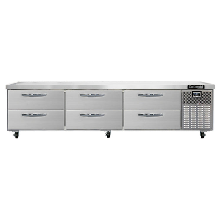 The Continental Refrigerator D108GN Refrigerator Griddle Stand Three-section (6) Drawers Six Drawers Accommodates (2) 12" X 20" X 6" is a highly functional unit engineered for the foodservice industry, combining efficiency with advanced refrigeration technology. This robust appliance features a three-section design and is equipped with six drawers, specifically accommodating two pans measuring 12 inches by 20 inches by 6 inches each, making it ideal for organized storage of ingredients in busy kitchen environments. The top of the stand is constructed with stainless steel, featuring a drip guard marine edge for added durability and ease of cleaning. Both the exterior and interior boast a stainless steel finish, ensuring longevity and resistance to corrosion. The unit includes electronic control with a digital display, providing precise temperature management and a hi-low alarm for consistent monitoring of conditions. Utilizing R290 hydrocarbon refrigerant and a 1/4 HP self-contained refrigeration system, this stand is energy-efficient and environmentally friendly. Certified by cETLus and NSF, it meets stringent standards for safety and sanitation, and its ENERGY STAR® rating highlights its commitment to energy conservation. This refrigerator griddle stand is a versatile solution for commercial kitchens seeking reliable, space-saving refrigeration.