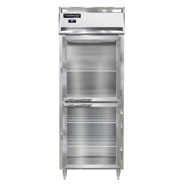 Continental Refrigerator, D1RENSAPTHD-GD-SD, Designer Line Wide Refrigerator, 22 cu. ft. capacity, pass-thru, 28-1/2" wide one-section, self-contained refrigeration, standard depth cabinet, electronic controller with digital display, wide half-height glass doors on front, wide half-height solid doors on rear, stainless steel exterior, aluminum interior, 6" stainless steel legs, NEMA-5-15P, 1/4 HP, cETLus, NSF, Made in the USA