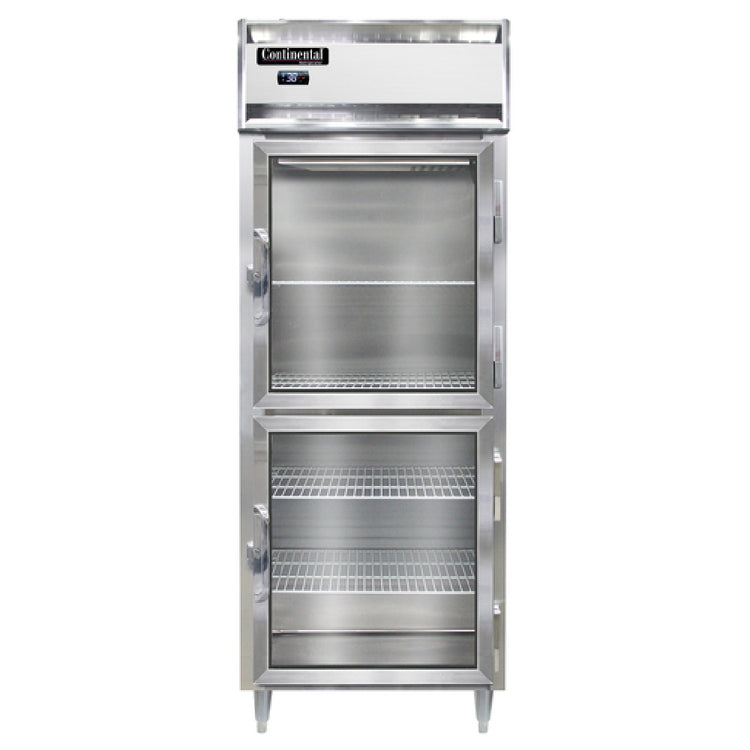 The Continental Refrigerator D1RENSSGDHD Designer Line Wide Refrigerator Reach-in is a meticulously engineered refrigeration unit tailored for diverse market segments seeking reliability and efficiency. With dimensions of 28-1/2"W, this one-section refrigerator is characterized by its self-contained refrigeration system and a sleek stainless steel exterior and interior, ensuring durability and a modern aesthetic. The unit features stainless steel front panels and a standard depth cabinet, complemented by wide half-height glass doors that enhance visibility and access. The inclusion of cylinder locks provides added security, while the electronic control with digital display allows for precise temperature management. Equipped with a hi-low alarm, the unit ensures the protection of stored contents. The refrigerator stands on 6" stainless steel legs, offering stability and ease of cleaning underneath. Utilizing R290 hydrocarbon refrigerant, this refrigerator is an eco-friendly choice with a 1/4 HP compressor ensuring efficient cooling. Certified by cETLus and NSF, the Continental Refrigerator D1RENSSGDHD meets stringent safety and sanitation standards, making it ideal for commercial kitchens, catering services, and food storage facilities seeking a blend of performance, sustainability, and compliance. Its thoughtful design and robust features cater to the needs of high-demand environments, providing reliable refrigeration solutions.