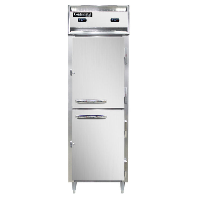 The Continental Refrigerator D1RFNHD Designer Line Refrigerator/Freezer Reach-in One-section is an exceptional appliance tailored for various commercial settings, merging efficiency, and style. The unit boasts a self-contained refrigeration system within a standard depth cabinet, underscoring its compact and space-efficient design. Featuring an aluminum exterior and interior with a sleek stainless steel front and doors, the aesthetic appeal is matched by its durability. The narrow half-height solid doors come equipped with cylinder locks, ensuring security in high-traffic environments. Its electronic control system, complete with a digital display and a hi-low alarm, facilitates precise temperature management. Notably, the freezer compartment is adjustable to reach temperatures as low as -10°F, thanks to its R290 hydrocarbon refrigerant, known for its environmentally friendly properties. With dual compressors rated at 1/5 and 1/3 HP, it offers robust refrigeration power. Certified by cETLus and NSF, the D1RFNHD adheres to stringent safety and quality standards. This refrigerator/freezer unit is an ideal choice for culinary professionals across restaurants, catering services, and institutional kitchens seeking reliability and advanced refrigeration capabilities. Its innovative design elements make it a versatile and valuable addition to any commercial kitchen setting.
