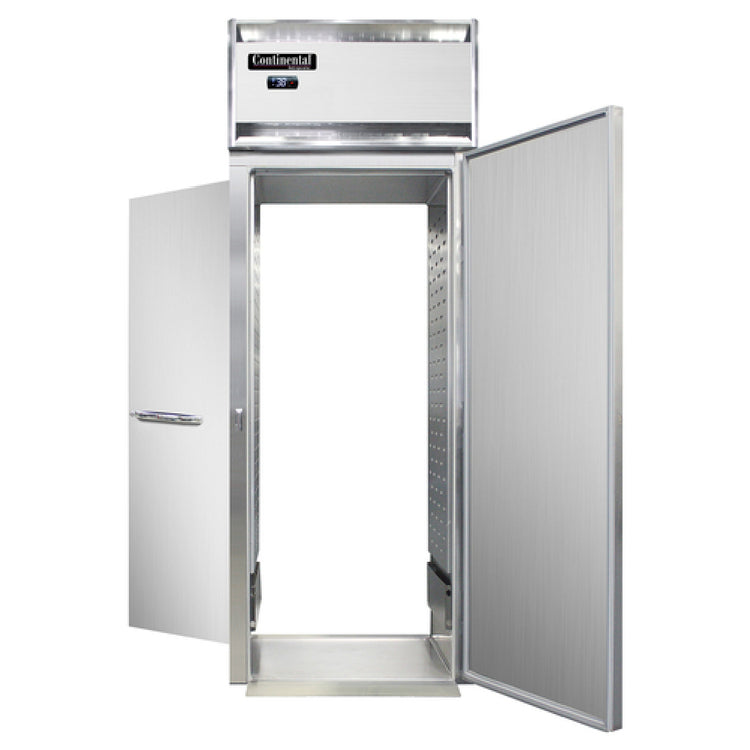 The Continental Refrigerator D1RINSART Designer Line Refrigerator Roll-thru One-section is an expertly engineered refrigeration solution, widely recognized for its robust design and efficiency. This unit is equipped with self-contained refrigeration and utilizes R290 hydrocarbon refrigerant, which is environmentally friendly and promotes efficient cooling. The exterior is constructed of durable stainless steel, while the interior is made of aluminum, ensuring longevity and reliability in demanding environments. The standard depth cabinet and full-height solid doors are designed to maximize storage capacity, meeting the diverse needs of various commercial kitchens. This model includes cylinder locks for enhanced security of stored items. The electronic control with a digital display allows for precise temperature management, while the hi-low alarm system ensures consistent monitoring of the refrigeration environment. Additional features include removable stainless steel ramps, facilitating easy access and mobility of items. With a power output of 1/3 HP, this refrigerator is both cETLus and NSF certified, meeting rigorous safety and sanitation standards. The D1RINSART is an ideal fit for institutions requiring a reliable roll-thru refrigeration unit, offering a unique value proposition through its combination of robust construction, precise control features, and compliance with industry standards.