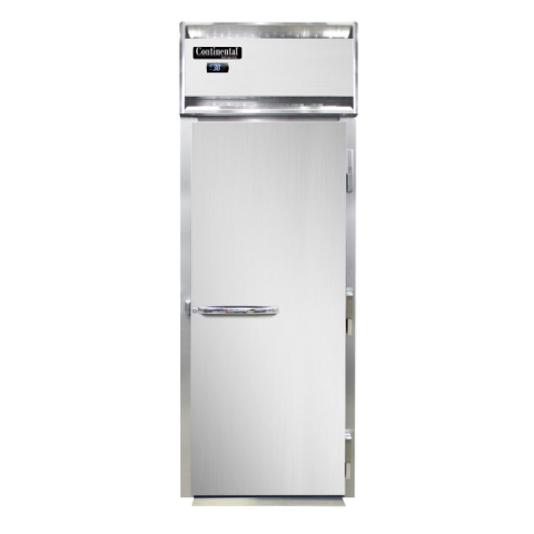 Continental Refrigerator, D1RINSSRT-SD-GD, Designer Line Refrigerator, 32 cu. ft. capacity, roll-thru, one-section, self-contained refrigeration, standard depth cabinet, full-height solid door on front, full-height glass door on rear, electronic controller with digital display, stainless steel exterior & interior, removable stainless steel ramps, NEMA-5-15P, 1/3 HP, cETLus, NSF, Made in the USA