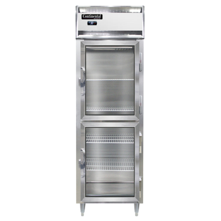 The Continental Refrigerator D1RNGDHD Designer Line Refrigerator Reach-in One-section is a sophisticated refrigeration unit designed for both style and functionality, suitable for various segments within the food service industry. This model integrates self-contained refrigeration, ensuring efficient and reliable cooling with its R290 hydrocarbon refrigerant and a 1/4 HP compressor. It features an aluminum exterior and interior, enhanced by a stainless steel front, providing durability and a sleek appearance. The standard depth cabinet is equipped with half-height glass doors, allowing for easy visibility while maintaining temperature efficiency. For security, cylinder locks are installed, making it ideal for environments where safety is paramount. The electronic control with a digital display ensures precise temperature management, complemented by a hi-low alarm system for consistent monitoring. Supported by 6-inch stainless steel legs, this unit offers stability and ease of cleaning. Certified by cETLus and NSF, it adheres to high safety and sanitation standards, making it a reliable choice for restaurants, cafes, and institutional kitchens. The Continental Refrigerator D1RNGDHD is designed to meet the demanding needs of the food service industry, combining advanced technology with a polished design to enhance any commercial kitchen setup.