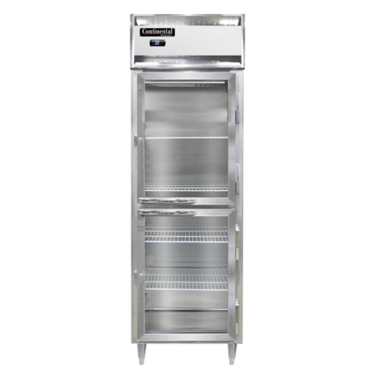 Continental Refrigerator, D1RNPTHD-GD-SD, Designer Line Refrigerator, 21 cu. ft. capacity, pass-thru, one-section, self-contained refrigeration, standard depth cabinet, electronic controller with digital display, half-height glass doors on front, half-height stainless steel doors on rear, aluminum exterior & interior, stainless steel front, 6" stainless steel legs, NEMA-5-15P, 1/4 HP, cETLus, NSF, Made in the USA