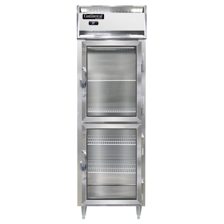 The Continental Refrigerator D1RNSAGDHD Designer Line Refrigerator Reach-in One-section provides an integrated solution for commercial refrigeration needs with its self-contained refrigeration system. This model stands out with its stainless steel exterior, ensuring durability and a professional appearance, while the aluminum interior supports efficient cooling and easy maintenance. Featuring a standard depth cabinet, the refrigerator includes half-height glass doors, which not only facilitate easy viewing of contents but also add a touch of elegance. Security is enhanced with cylinder locks, providing peace of mind in busy environments. The electronic control with a digital display allows precise temperature management, complemented by a hi-low alarm for enhanced monitoring. The refrigerator stands on 6-inch stainless steel legs, providing stability and ease of cleaning underneath. Utilizing R290 hydrocarbon refrigerant, the unit is environmentally friendly and energy-efficient, driven by a 1/4 HP compressor. Certified by cETLus and NSF, it meets high standards for safety and sanitation, making it an excellent choice for restaurants, cafes, and food service operations that demand reliability and performance.