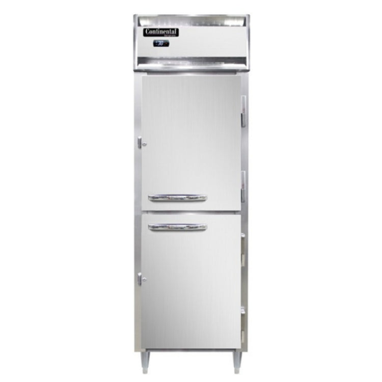 Continental Refrigerator, D1RNSAPTHD-SD-GD, Designer Line Refrigerator, 21 cu. ft. capacity, pass-thru, one-section, self-contained refrigeration, standard depth cabinet, electronic controller with digital display half -height solid doors on front, half-height glass doors on rear, stainless steel exterior, aluminum interior, 6" stainless steel legs, NEMA-5-15P, 1/4 HP, cETLus, NSF, Made in the USA