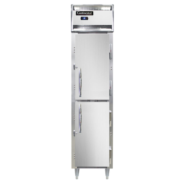 The Continental Refrigerator D1RSESNSSHD Designer Slim Line Refrigerator is a high-performance, reach-in appliance designed to cater to the needs of various segments within the food service industry. With a narrow 17-3/4" width, this one-section refrigerator is perfect for kitchens where space is at a premium. Its self-contained refrigeration system features a durable stainless steel exterior and interior, ensuring longevity and ease of maintenance. The refrigerator's shallow depth cabinet and narrow half-height solid door make it an excellent choice for tight spaces, while the included cylinder lock provides security for stored items. The unit is equipped with an electronic control system with a digital display, offering precise temperature management. A hi-low alarm adds an extra layer of protection by alerting users to any temperature deviations. The refrigerator stands on 6" stainless steel legs, providing stability and ease of cleaning beneath the unit. Utilizing R290 hydrocarbon refrigerant and powered by a 1/4 HP compressor, this refrigerator is both eco-friendly and efficient. Certified by cETLus and NSF, the Continental Refrigerator D1RSESNSSHD meets stringent safety and sanitation standards, making it a reliable choice for any professional kitchen environment.