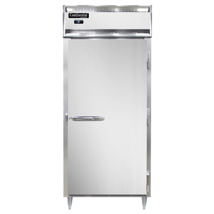 The Continental Refrigerator D1RXN Designer Line Extra-Wide Refrigerator is a robust and efficient solution designed for various industry segments requiring reliable cold storage. With a generous width of 36-1/4", this one-section, reach-in refrigerator is perfect for settings where space and accessibility are essential. The unit features a self-contained refrigeration system, ensuring efficient cooling with its R290 hydrocarbon refrigerant and a powerful 1/3 HP compressor. The exterior and interior are crafted from durable aluminum, complemented by a stainless steel front for enhanced durability and aesthetic appeal. The standard depth cabinet is equipped with a wide full-height solid door, secured by a cylinder lock, ensuring the safety of stored items. Operators can easily monitor and control the unit's performance via its electronic control with a digital display, complete with a hi-low alarm for added peace of mind. The refrigerator stands on 6" adjustable stainless steel legs, offering stability and easy cleaning access. Certified by cETLus and NSF, the D1RXN adheres to stringent safety and sanitation standards, making it an ideal choice for restaurants, cafeterias, and other commercial food service environments. Its blend of style, functionality, and reliability positions it as a valuable asset in any professional kitchen.