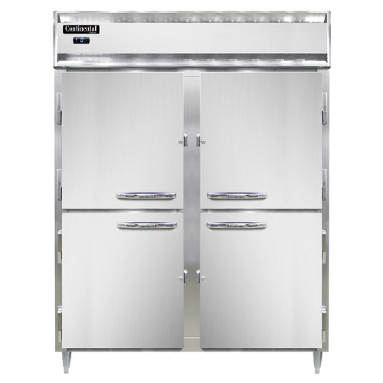 The Continental Refrigerator D2FENPTHD Designer Line Wide Freezer is a pass-thru unit measuring 57 inches in width, designed to meet the demanding needs of commercial kitchens and food service establishments. This two-section freezer features a self-contained refrigeration system, ensuring consistent and efficient cooling performance. The exterior and interior are constructed from durable aluminum, complemented by a sleek stainless steel front for enhanced durability and aesthetic appeal. The standard depth cabinet is equipped with wide half-height solid doors, which include cylinder locks for added security. The electronic control system, complete with a digital display and hi-low alarm, offers precise temperature management essential for maintaining optimal storage conditions. Standing on 6-inch stainless steel legs, this freezer provides stability and easy access for cleaning and maintenance. Powered by a robust 1 horsepower motor, it is cETLus and NSF certified, meeting stringent safety and sanitation standards. This freezer is ideally suited for a variety of commercial environments, from bustling restaurants to high-demand catering services, offering reliable storage solutions with a focus on security and performance. Its pass-thru design facilitates convenient access from both sides, making it a versatile addition to any professional kitchen layout.