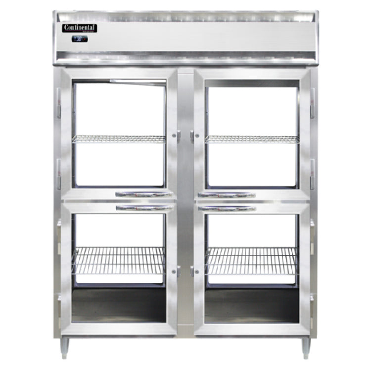 Continental Refrigerator, D2RENPTHD-GD-GD, Designer Line Wide Refrigerator, 52 cu. ft. capacity, pass-thru, 57" wide two-section, self-contained refrigeration, standard depth cabinet, electronic controller with digital display, wide half-height glass doors on front and rear, aluminum exterior & interior, stainless steel front, 6" stainless steel legs, NEMA-5-15P, 1/2 HP, cETLus, NSF, Made in the USA