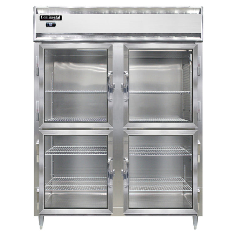 The Continental Refrigerator D2RENSAGDHD Designer Line Wide Refrigerator Reach-in is a robust refrigeration unit designed for commercial use, featuring a spacious 57-inch wide two-section configuration. Its self-contained refrigeration system ensures efficient cooling with a 1/3 HP motor, utilizing the eco-friendly R290 hydrocarbon refrigerant for reduced environmental impact. The exterior is constructed from durable stainless steel, while the interior features aluminum, offering a blend of strength and lightweight performance. The refrigerator boasts a standard depth cabinet equipped with wide half-height glass doors, enhancing visibility and accessibility. Security is prioritized with the inclusion of cylinder locks, making it suitable for environments requiring stringent access control. An electronic control system with a digital display offers precise temperature management and features a hi-low alarm for added operational safety. The unit stands on 6-inch stainless steel legs for stability and easy cleaning underneath. Certified by cETLus and NSF, this refrigerator meets rigorous safety and sanitation standards, making it an ideal choice for diverse market segments, including restaurants, catering services, and food retail outlets, where reliable and efficient refrigeration is paramount.