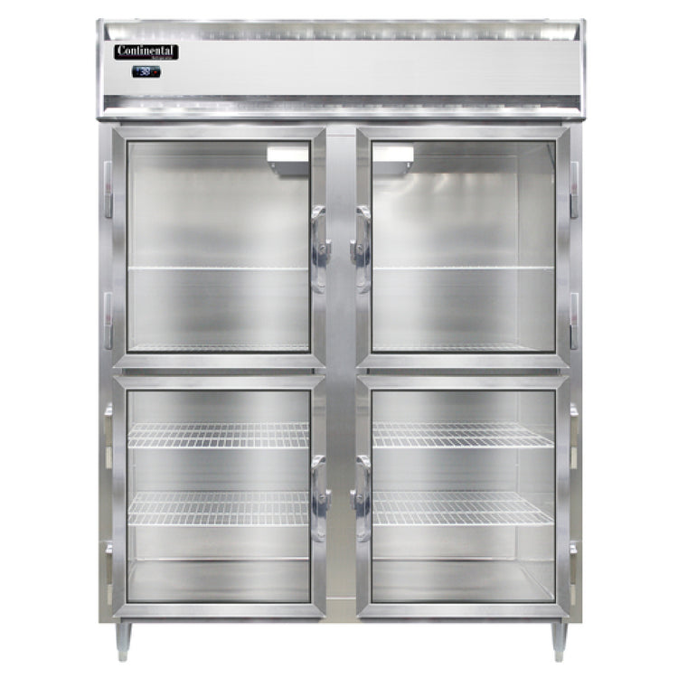 The Continental Refrigerator D2RESNGDHD Designer Line Wide Refrigerator Reach-in 57"W is a robust and efficient solution for commercial refrigeration needs. This two-section unit is engineered with a self-contained refrigeration system, ensuring consistent cooling performance. Its exterior and interior are constructed from durable aluminum, paired with a sleek stainless steel front for enhanced durability and aesthetics. With a shallow depth cabinet design, it is an ideal fit for various kitchen layouts. The refrigerator features wide half-height glass doors for easy visibility and access, complemented by cylinder locks for security. The electronic control system with a digital display facilitates precise temperature management, while the hi-low alarm provides additional safety by alerting users to temperature fluctuations. Supported by 6" stainless steel legs, this refrigerator offers stability and easy cleaning beneath the unit. Utilizing R290 Hydrocarbon refrigerant, it aligns with eco-friendly standards. With a 1/3 HP compressor, the unit ensures reliable operation, and its certification by cETLus and NSF confirms adherence to safety and sanitation requirements. This Designer Line Refrigerator is crafted to meet the dynamic needs of foodservice establishments, combining efficiency, style, and environmentally conscious technology in one versatile package.