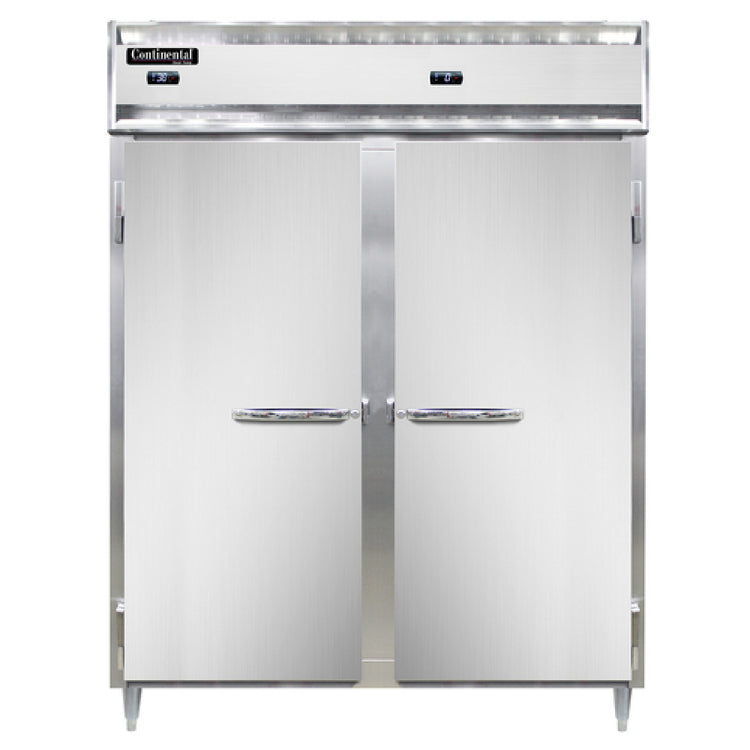 The Continental Refrigerator D2RFENSS Designer Line Refrigerator/Freezer Reach-in is a robust solution tailored for various segments within the food service industry. This two-section unit, measuring 57 inches in width, features a self-contained refrigeration system, ensuring efficient operation in diverse environments. Its stainless steel exterior and interior provide both durability and a sleek, professional aesthetic. The standard depth cabinet is equipped with wide full-height solid doors, each secured with reliable cylinder locks for added security. An advanced electronic control with a digital display allows for precise monitoring, complemented by a hi-low alarm for enhanced safety. Utilizing the environmentally friendly R290 Hydrocarbon refrigerant, this unit is designed with dual compressors - a 1/4 HP and a 1/2 HP - to optimize cooling efficiency. Certified by cETLus and NSF, the D2RFENSS ensures compliance with stringent safety and sanitation standards, making it a valuable asset for restaurants, cafeterias, and other commercial kitchens seeking reliable refrigeration performance.