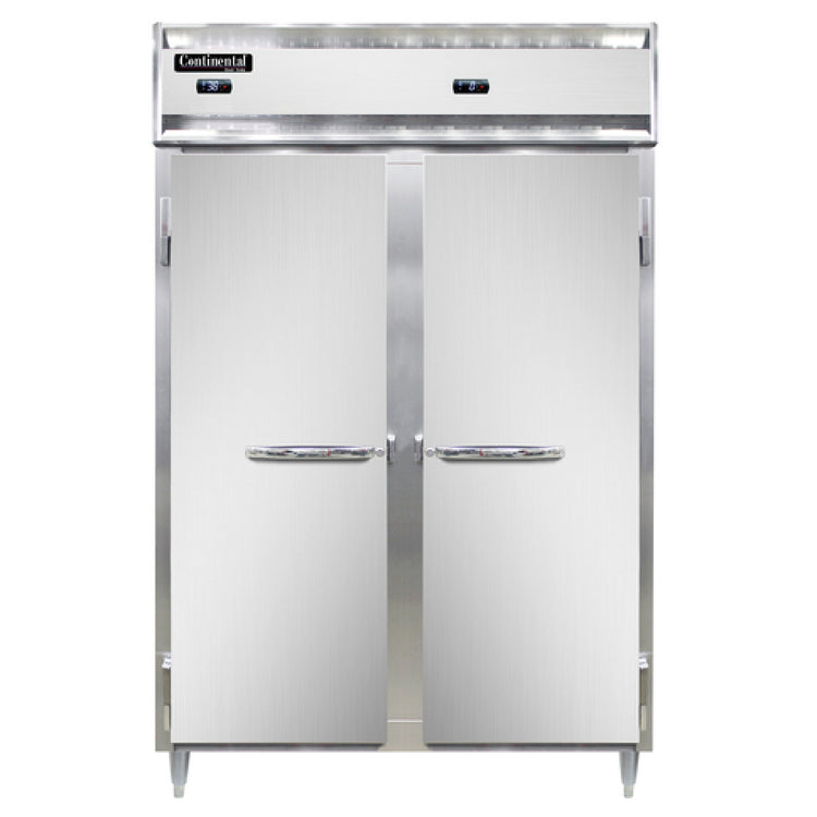 The Continental Refrigerator D2RFNSS Designer Line Refrigerator-Freezer Reach-in Two-section is a high-performance unit designed for commercial environments requiring reliable refrigeration. It features a self-contained refrigeration system and a robust stainless steel exterior and interior, ensuring durability and ease of cleaning. This unit includes a standard depth cabinet with narrow full-height solid doors, providing ample storage space while maintaining a sleek profile. Each door is equipped with a cylinder lock, offering secure storage for valuable contents. The electronic control system boasts a digital display and hi-low alarm for precise temperature monitoring and alerts. Utilizing R290 Hydrocarbon refrigerant, this refrigerator-freezer is environmentally friendly while delivering efficient cooling. It operates with dual 1/4 and 1/2 HP compressors, ensuring powerful and consistent performance. Certified by cETLus and NSF, it meets rigorous safety and sanitation standards, making it a dependable choice for restaurants, hotels, and other food service establishments. The Continental Refrigerator D2RFNSS is engineered to provide exceptional temperature control and storage solutions across various segment markets, enhancing operational efficiency and preserving the quality of stored items.