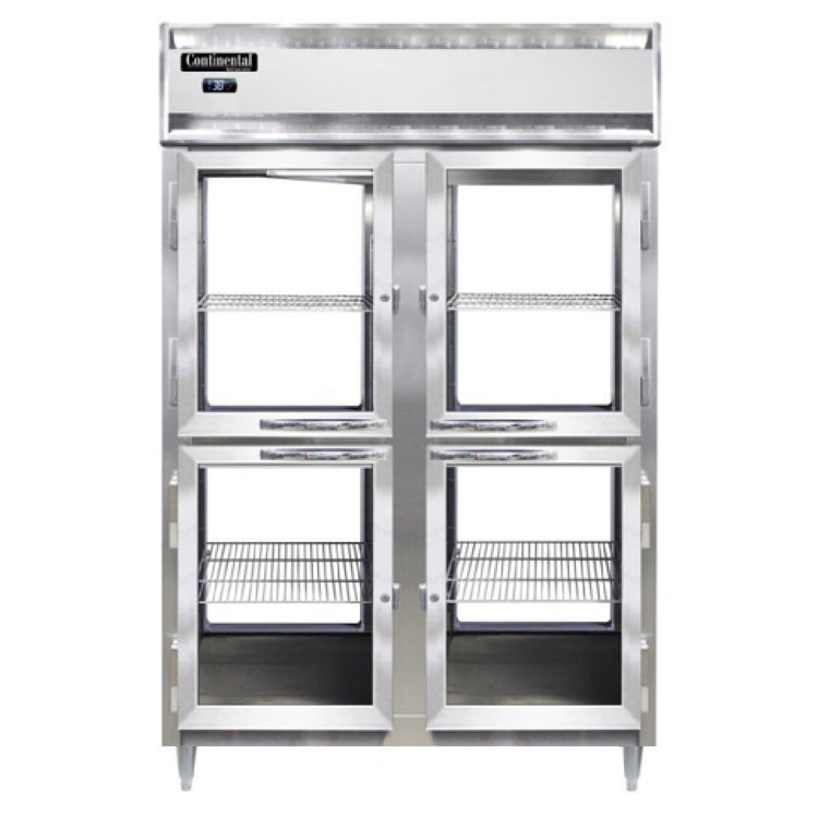 Continental Refrigerator, D2RNSSPTHD-GD-GD, Designer Line Refrigerator, 50 cu. ft. capacity, pass-thru, two-section, self-contained refrigeration, standard depth cabinet, electronic controller with digital display, half-height glass doors on front and rear, stainless steel exterior & interior, 6" stainless steel legs, NEMA-5-15P, 1/2 HP, cETLus, NSF, Made in the USA
