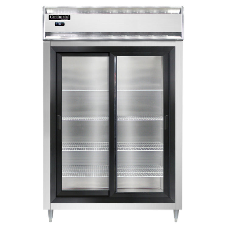 The Continental Refrigerator D2RNSSSGD Designer Line Refrigerator is a high-performance, reach-in, two-section refrigeration unit crafted with both a stainless steel exterior and interior, ensuring durability and ease of cleaning. This refrigerator features a standard depth cabinet and is equipped with full-height sliding glass doors, providing easy access while maintaining optimal visibility of the contents stored within. The inclusion of cylinder locks enhances security, making it suitable for environments where controlled access is paramount. The electronic control system, complete with a digital display and a hi-low alarm, allows for precise temperature management, ensuring the preservation of perishable goods. Standing on 6-inch stainless steel legs, this model is engineered for stability and resilience. It utilizes R290 Hydrocarbon refrigerant, a more environmentally friendly option, and operates with a 1/3 HP compressor. Certified by cETLus and NSF, it meets rigorous safety and sanitation standards, making it an excellent choice for commercial kitchens, food service operations, and retail environments where reliability and efficiency are key. Its thoughtful design and robust construction provide significant advantages within the industry, offering a unique blend of style, functionality, and energy efficiency.