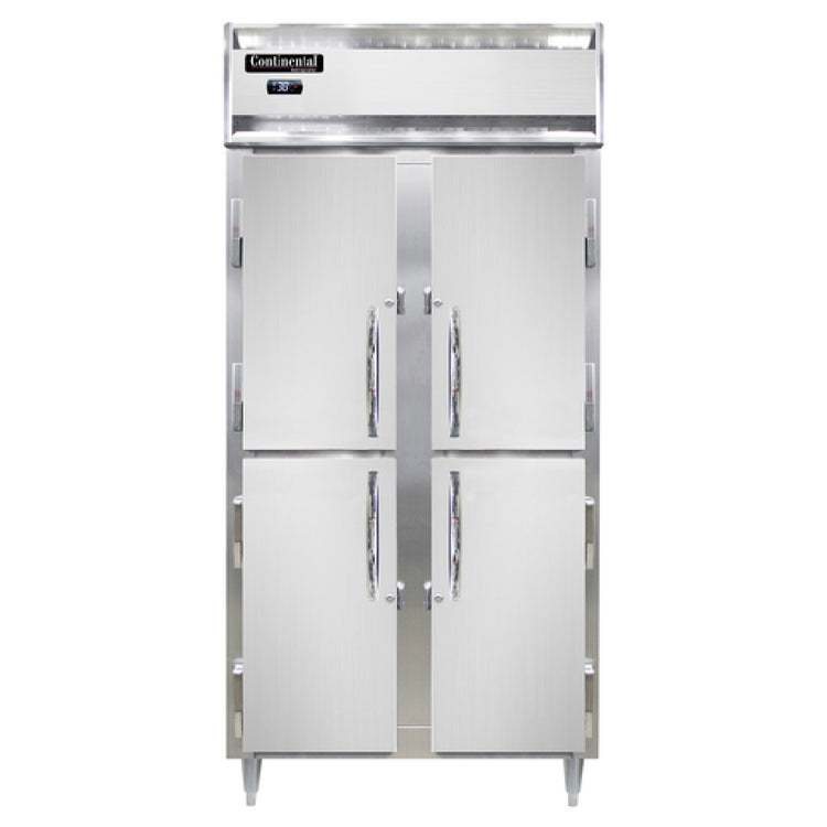 The Continental Refrigerator D2RSENSAHD Designer Slim Line Refrigerator is a reach-in unit measuring 36-1/4 inches in width, engineered for spaces where a compact yet efficient refrigeration solution is necessary. This two-section refrigerator features a self-contained refrigeration system, ensuring optimal cooling performance with ease of installation. The stainless steel exterior and front provide durability and a sleek aesthetic, while the aluminum interior facilitates efficient temperature management and easy cleaning. A standard depth cabinet accommodates storage needs with narrow half-height stainless steel doors, which are equipped with cylinder locks for added security. The refrigerator's electronic control with a digital display allows precise temperature adjustments, supported by a hi-low alarm for enhanced operational safety. Standing on 6-inch stainless steel legs, it maintains stability and ease of cleaning underneath. Utilizing R290 hydrocarbon refrigerant, the unit is not only environmentally friendly but also compliant with cETLus and NSF standards, ensuring reliability and safety. Powered by a 1/3 HP motor, this refrigerator is ideal for various segments within the foodservice industry, providing a space-efficient, high-performance refrigeration solution for commercial kitchens, restaurants, and catering facilities. Its design and functionality encapsulate the balance of form and function required in modern foodservice environments.