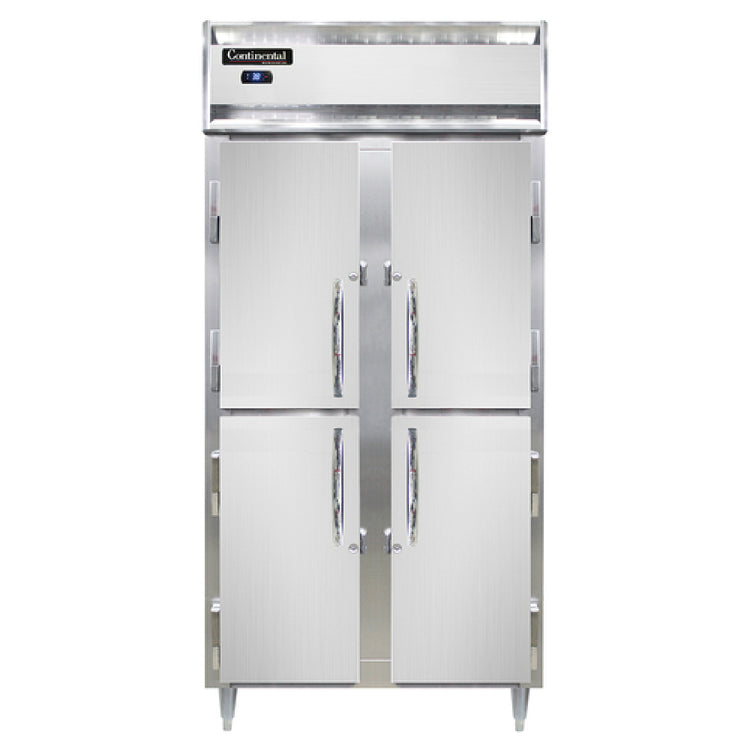 The Continental Refrigerator D2RSESNHD Designer Slim Line Refrigerator is a highly versatile unit designed for commercial kitchens that require efficient storage solutions without compromising on space. With a width of 36-1/4 inches, this two-section, reach-in refrigerator features a self-contained refrigeration system, making it ideal for businesses with limited kitchen space. The exterior and interior are constructed from durable aluminum, complemented by a sleek stainless steel front that adds a touch of sophistication to any kitchen environment. The shallow depth cabinet is equipped with narrow half-height stainless steel doors, each fitted with cylinder locks for enhanced security. This refrigerator utilizes an electronic control system with a digital display, offering precise temperature management and a hi-low alarm for optimal food safety. Supported by 6-inch stainless steel legs, the unit ensures stability and ease of cleaning underneath. The D2RSESNHD model uses R290 hydrocarbon refrigerant and operates with a 1/3 HP compressor, providing an eco-friendly and efficient cooling solution. This refrigerator is cETLus and NSF certified, verifying its adherence to rigorous safety and hygiene standards. Whether for a bustling restaurant or a compact cafe, this unit offers reliable performance and a refined design to meet diverse refrigeration needs.