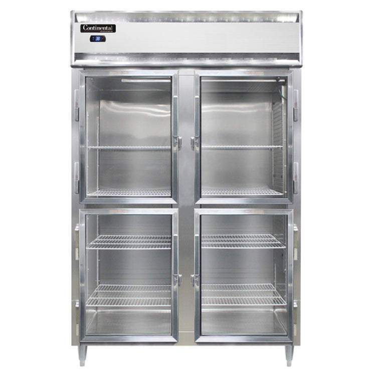 The Continental Refrigerator D2RSNSAGDHD Designer Line Refrigerator Reach-in Two-section is a high-performance refrigeration unit designed for commercial applications, particularly in settings where space and presentation are crucial. This self-contained refrigerator features a stainless steel exterior paired with an aluminum interior, ensuring durability and ease of maintenance. Its shallow depth cabinet enhances its versatility, fitting seamlessly into space-conscious commercial environments while still providing ample storage. The unit includes half-height glass doors with cylinder locks, which offer both visibility and security for stored items. An electronic control system with a digital display allows for precise temperature management, while a hi-low alarm ensures consistent performance and product safety. Supported on 6-inch stainless steel legs, this refrigerator is stable and easy to clean beneath. Utilizing R290 hydrocarbon refrigerant and powered by a 1/3 HP compressor, it is environmentally friendly and energy-efficient. The D2RSNSAGDHD is certified by cETLus and NSF, confirming its compliance with rigorous safety and sanitation standards. This refrigerator's unique combination of features makes it a top choice for restaurants, hotels, and any commercial kitchen setting that prioritizes efficiency and product visibility without compromising on quality and design.