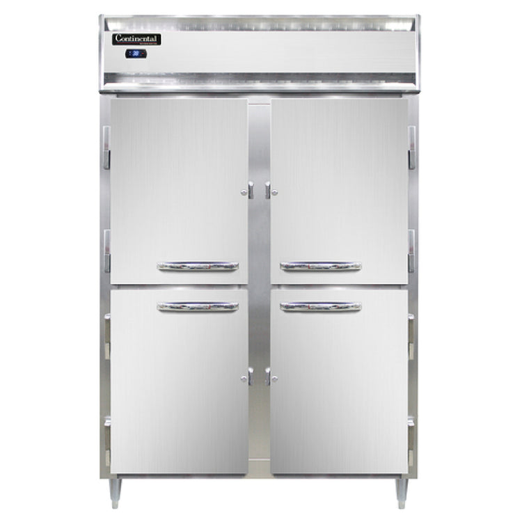 The Continental Refrigerator D2RSNSSHD Designer Line Refrigerator is a reach-in, two-section unit that combines functionality with sleek design, making it ideal for commercial kitchens that demand reliability and style. This refrigerator features a self-contained refrigeration system housed within a shallow depth cabinet, perfect for spaces with limited room. Its exterior and interior are crafted from durable stainless steel, ensuring longevity and ease of maintenance. The half-height stainless steel doors are equipped with cylinder locks for added security. The unit includes an electronic control system with a digital display, allowing for precise temperature management, alongside a hi-low alarm for monitoring. Standing on 6-inch stainless steel legs, it provides stability and accessibility. This refrigerator uses R290 hydrocarbon refrigerant, which is environmentally friendly, and operates with a 1/3 HP motor. Certified by cETLus and NSF, it meets high safety and sanitation standards. Additionally, its ENERGY STAR® rating signifies its energy efficiency, making it a cost-effective choice for businesses. This model is a versatile solution for various market segments within the food service industry, offering high performance and energy savings without compromising on storage capacity or accessibility.