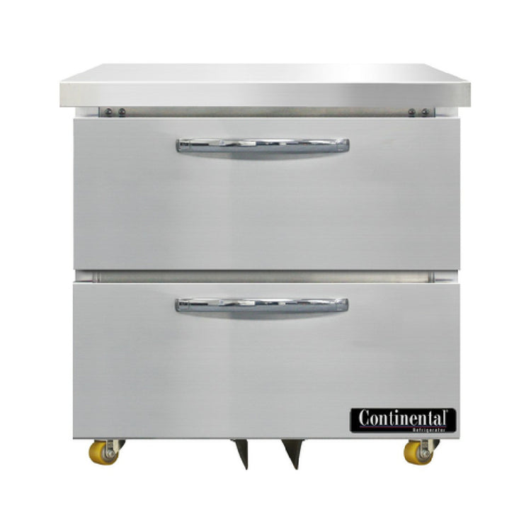 The Continental Refrigerator D32N-U-D Designer Line Undercounter Refrigerator 32"W is a versatile refrigeration solution tailored for the demands of professional kitchens. This one-section undercounter refrigerator features two drawers, each with the capacity to hold one 12 x 20 x 6 pan or a combination of one 1/2 x 6 pan and two 1/3 x 6 pans, enhancing its flexibility for varied storage needs. Constructed with a stainless steel exterior and interior, including a stainless steel top, it ensures durability and a sleek appearance. The unit is fitted with 1-3/8" diameter plate casters for easy mobility and a front breathing design, suitable for tight spaces. Its electronic control with digital display provides precise temperature management, complemented by a hi-low alarm for added security. The rear mounted self-contained refrigeration system uses R290 hydrocarbon refrigerant and is powered by a 1/5 hp motor, ensuring efficient cooling. Certified by cETLus and NSF, it meets stringent safety and sanitation standards, making it an ideal choice for commercial environments where reliability and performance are paramount.