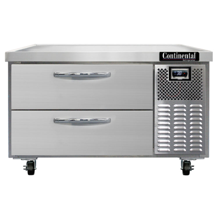 The Continental Refrigerator D36GN Refrigerator Griddle Stand is a versatile and efficient refrigeration solution designed for kitchens and foodservice environments that require reliable cold storage with easy access. This one-section unit features two drawers that can accommodate various pan sizes, including one 12" x 20" x 6" pan and one 6" x 20" x 6" pan, offering flexibility for different storage needs. Constructed with a stainless steel top equipped with a drip guard marine edge, along with a stainless steel exterior and interior, this griddle stand ensures durability and easy cleaning, ideal for busy kitchens. The electronic control with a digital display provides convenient monitoring and precise temperature management, supported by a built-in high/low temperature alarm for added safety. The self-contained refrigeration system uses R290 hydrocarbon refrigerant, an environmentally friendly choice that aligns with modern energy standards, as evidenced by its ENERGY STAR certification. With a 1/5 HP compressor and a 10' cord, the unit offers dependable performance and practical installation options. Certified by cETLus and NSF, this refrigerator griddle stand meets stringent safety and sanitation requirements, making it a trusted choice for restaurants, catering services, and other foodservice operations seeking an efficient and reliable refrigeration solution.