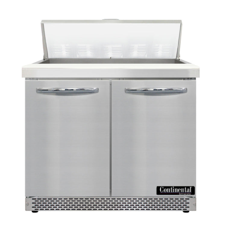 The Continental Refrigerator D36N10-FB Designer Line Sandwich Unit Front Breather is an advanced refrigeration solution tailored for culinary professionals aiming to enhance efficiency and maintain quality. With its 36"W, two-section design, this unit accommodates (10) 1/6 size x 4" deep pans, complemented by a 12" cutting board, facilitating streamlined food preparation. Its construction boasts a robust stainless steel top, front, sides, and interior, ensuring durability and ease of cleaning. The unit features electronic control with a digital display and hi-low alarm, offering precise temperature regulation essential for maintaining food safety standards. Equipped with (2) field rehingeable doors, it provides flexibility in kitchen setups. The rear-mounted self-contained refrigeration system employs R290 hydrocarbon refrigerant, promoting eco-friendly operation with a 1/5 hp compressor. Automatic hot gas condensate evaporator enhances efficiency, while 3-3/4" casters facilitate mobility. Certified by cETLus and NSF, this unit meets rigorous industry standards, making it a versatile and reliable choice for restaurants, delis, and catering businesses. The Continental Refrigerator D36N10-FB stands out in the refrigeration market, combining advanced technology with user-friendly features to meet the diverse needs of food service establishments.