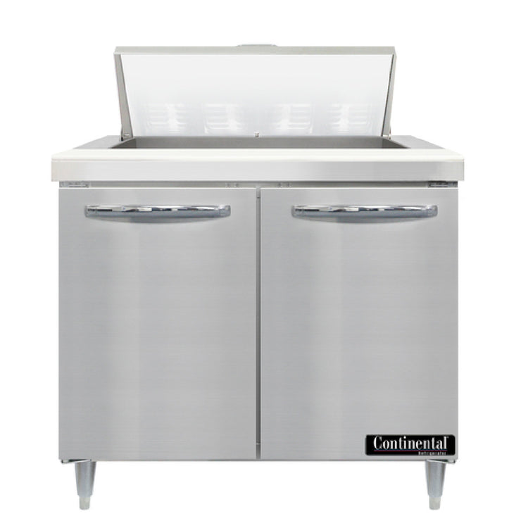 The Continental Refrigerator D36N8 Designer Line Sandwich Unit 36"W Two-section is a versatile refrigeration solution tailored for food service operations requiring efficient sandwich and salad preparation. This unit features a robust stainless steel top, front, sides, and interior, ensuring durability and easy maintenance in high-demand environments. It is equipped with eight 1/6 size pans that are 4" deep, alongside a 12" cutting board, providing ample space for ingredients and preparation tasks. The D36N8's refrigeration system includes a rear mounted self-contained system with a 1/5 hp compressor utilizing environmentally-friendly R290 hydrocarbon refrigerant, ensuring energy efficiency and compliance with modern eco-standards. The automatic hot gas condensate evaporator allows for efficient operation, reducing manual maintenance tasks. Enhanced by an electronic control with a digital display and hi-low alarm, this unit ensures optimal temperature management to preserve food freshness. The two field rehingeable doors provide flexibility in kitchen layout and accessibility, while the 6" adjustable legs contribute to stability and ease of installation. Certified by cETLus and NSF, the D36N8 meets rigorous safety and sanitation standards, making it an ideal choice for restaurants, cafes, and catering services looking for reliable and efficient refrigeration solutions.